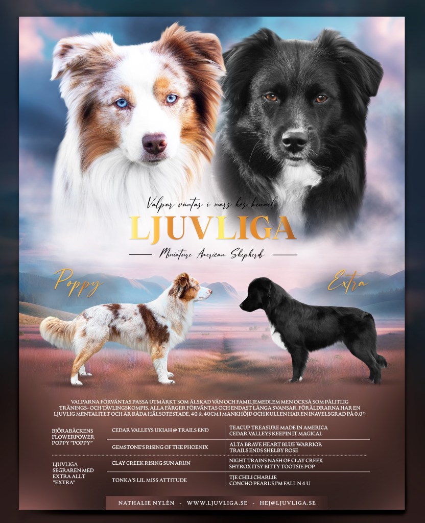 Vid intresse av en valp från Extra och Poppys kull, anmäl dig till vår valplista på sidan “kontakt.” Om du redan skrivit upp dig på vår valplista sedan tidigare behöver du inte göra det igen, du kommer då att få ett automatiskt mail med möjlighet att anmäla ditt valpintresse till just den här kullen.