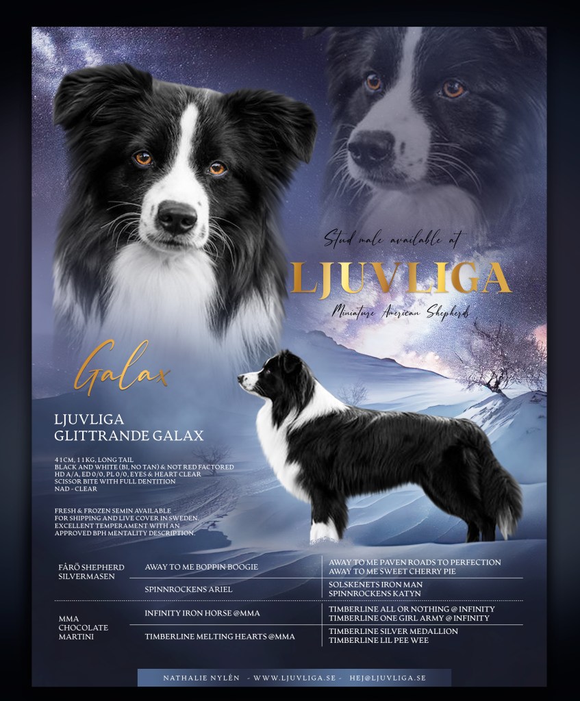 Molles första kull är Sockerbitskullen tillsammans med Ljuvliga Toscasmulorna Runt Nosen ”Tosca” där han fick 5 valpar 20250222 hos oss på kennel Ljuvliga.