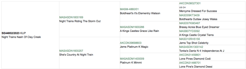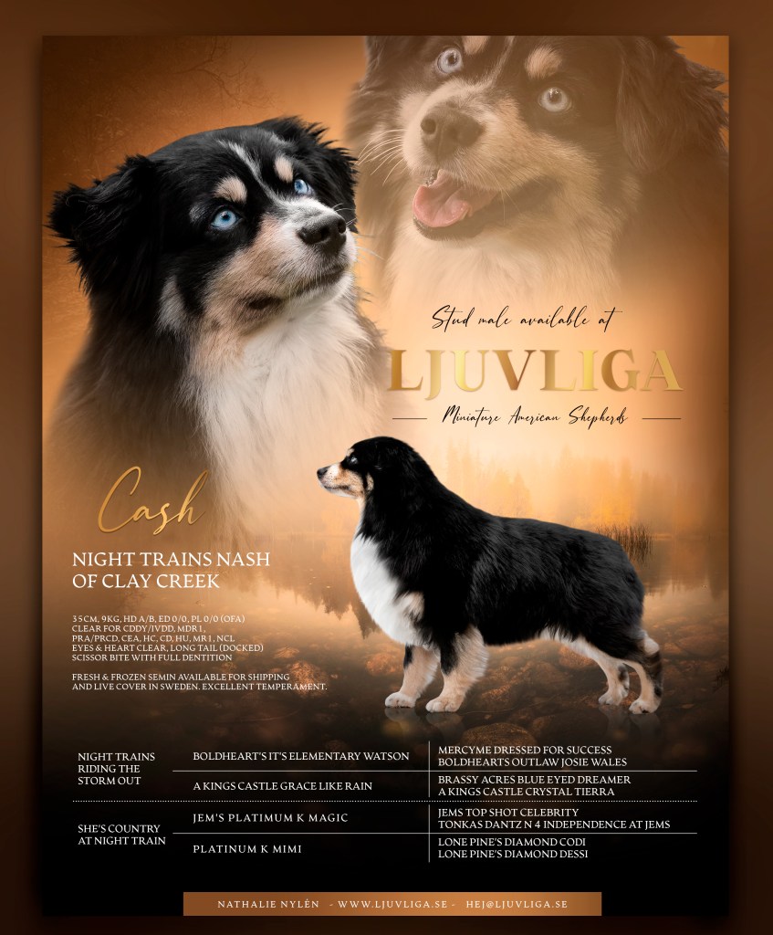 Cash första kull är Universums Urkrafter tillsammans med Minions Misty Meadow ”Sia” där han fick 2 valpar 20200117 hos oss på kennel Ljuvliga (då Cash var registrerad i AKC och ej ännu SKK vid tiden för kullen är valparna registrerade på hans amerikanska registreringsnummer AKCDN61001301.)
