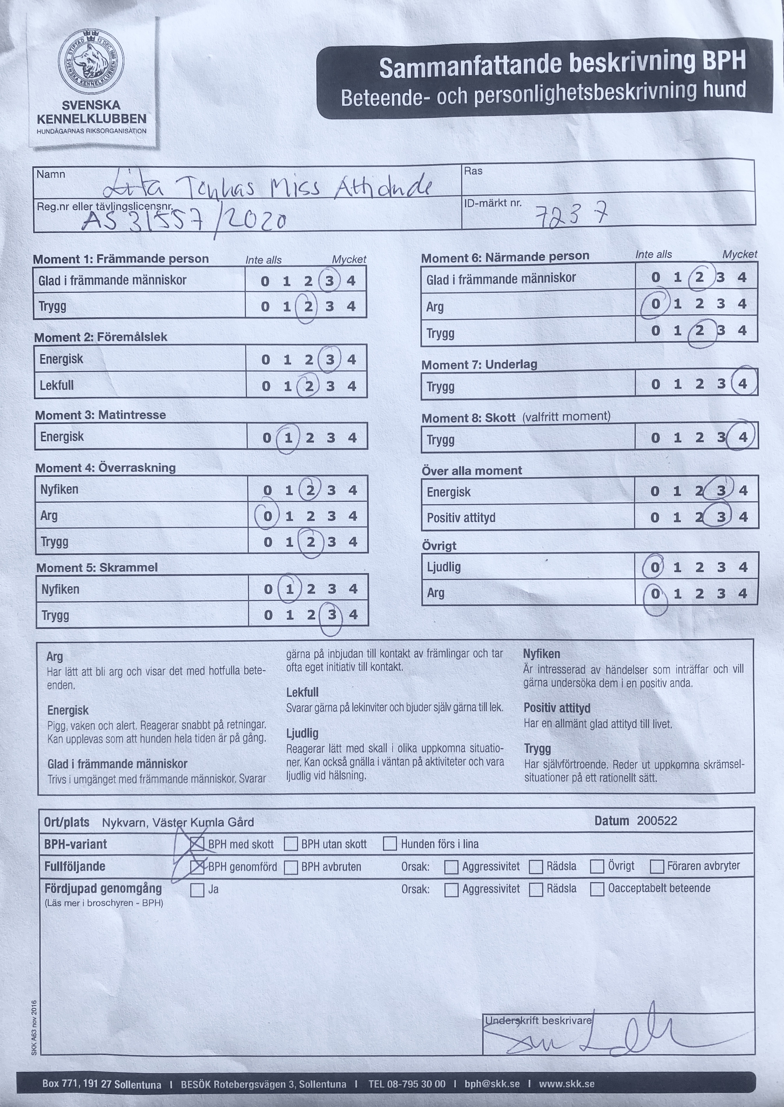 Lita är en så oerhört fantastisk hund på alla sätt och vis så det är svårt för mig att bara välja en enda sak som jag är extra nöjd med, så jag väljer istället hennes betyg på det övergripande. Treor på “energisk” och “positiv attityd” samt nollor på “ljudlig” och “arg”, vilket beskriver henne på pricken. Jag har sällan sett henne arg eller hört henne skälla, samtidigt som hon har massor av motor och tryck under tassarna. I kombination med att hon är den mest samarbetsvilliga, kontaktsökande och föriga/följsamma hunden jag någonsin träffat är hon helt enkelt ett riktigt lyckopiller. Det enda i hennes protokoll jag kan komma på som jag skulle kunna vara missnöjd med är att hon inte fick full pott på lekfullheten eftersom hon lekte med, men inte grep tag i, testledarens leksak – men jag tröstar mig med att hon är desto mer lekfull i vardagen.