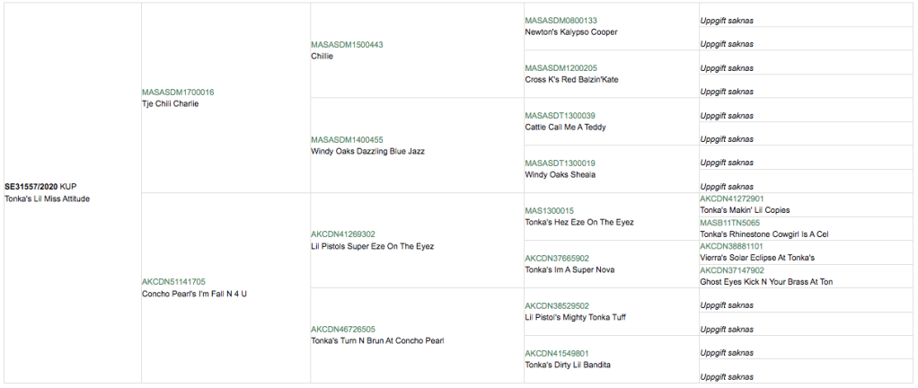 Lita pensionerades efter att ha bidragit till vårt avelsprogram med 28 valpar med tre olika hanar. Från dessa tre kullar har vi valt att gå vidare i avel med hennes första kull framförallt på hansidan, men vi har även stora förhoppningar om att kunna gå vidare på tiksidan med någon av hennes andra två kullar. Litas bidrag till vårt avelsarbete kan inte nog understrykas och vi njuter av att se henne leva livets glada dagar hos sin före detta fodervärd och numera ägare, Elin i Uppsala.