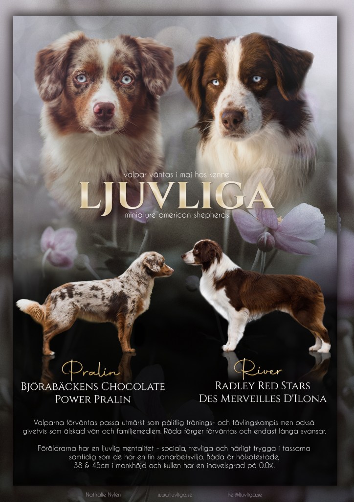 20220503 föddes fem små godbitar här hemma på ön – två röda trefärgade hanar samt tre tikar, varav två röda trefärgade och en red merle. Moder var Björabäckens Chocolate Power ”Pralin” och fader var Radley Red Stars Des Merveilles D´Ilona ”River”.