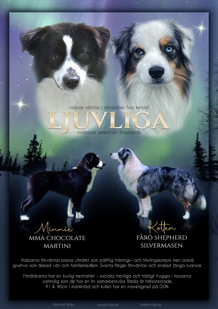20221105 föddes sex små himlafenomen – en svart och vit tik samt fem hanar varav två svarta trefärgade, två svarta och vita samt en blue merle. Moder var MMA Chocolate Martini ”Minnie” och fader var Fårö Shepherd Silvermasen ”Kotten”.