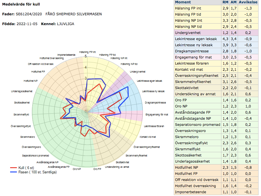 | Stamtavlenamn | Tilltalsnamn | Kön | Färg | Mankhöjd | Höfter | Armbågar | Knän/patella | Tänder | BPH | Övrigt |