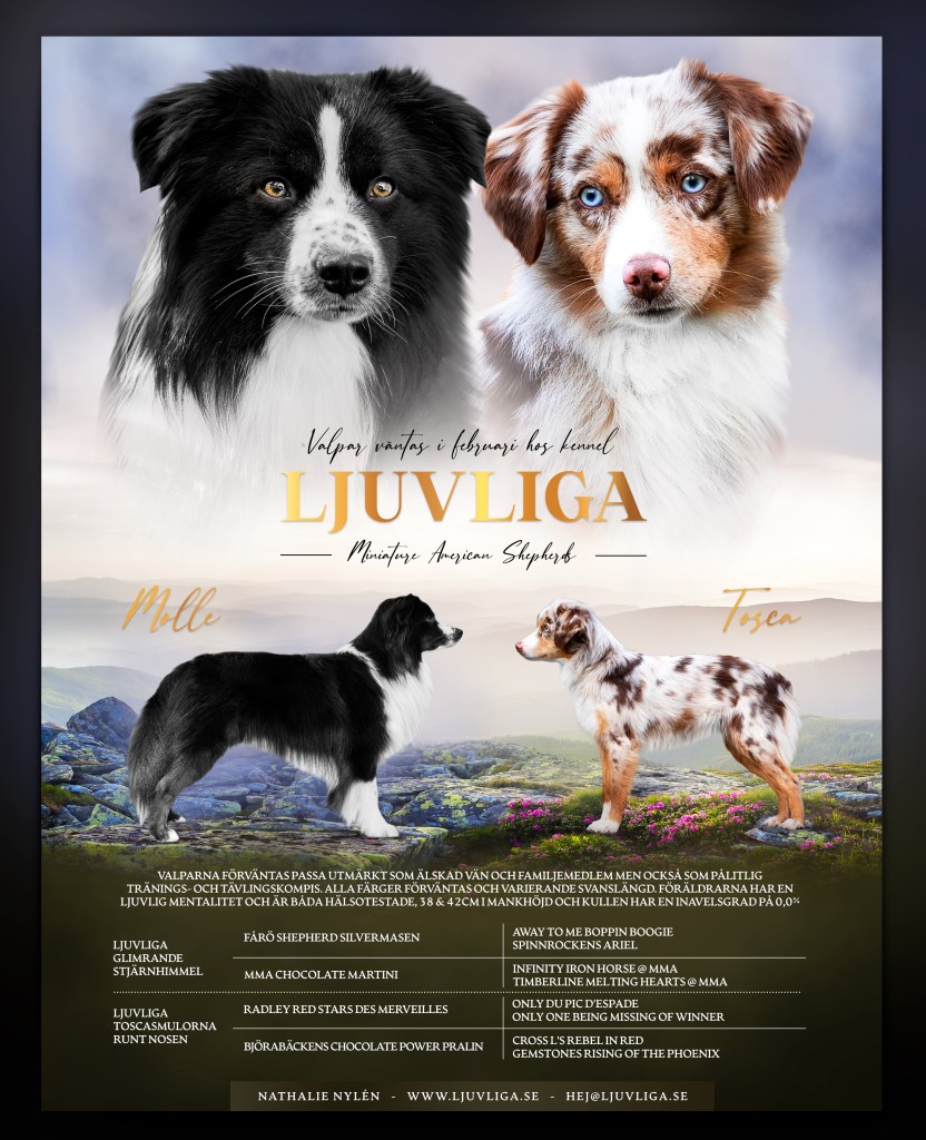 20240222 föddes fem små sockerbitar – två redmerlehanar, en röd trefärgad hane, en röd trefärgad tik och en redmerletik. Moder var Ljuvliga Toscasmulorna Runt Nosen ”Tosca” och fader var Ljuvliga Glimrande Stjärnhimmel ”Molle”.