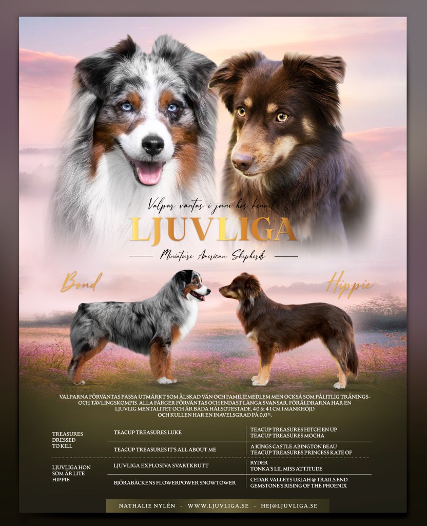 20250623 föddes en liten trio – två tikar varav en blue merle och en svart trefärgad, samt en red merlehane. Moder var Ljuvliga Ho Som Är Lite Hippie ”Hippie” och fader var Treasures Dressed To Kill ”Bond.”
