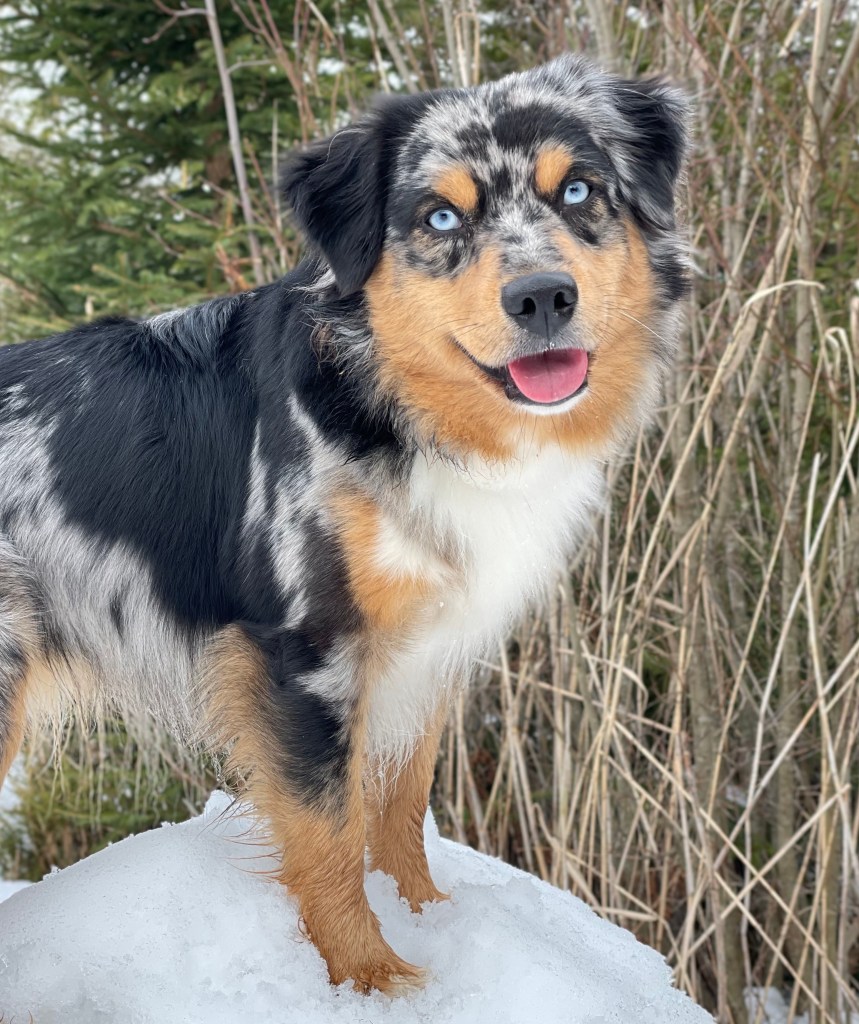| Universums Urkraft Yang | Louie | Hane | Blue merle med vitt & tan | 42cm | A/A | 0/0 | 0/0 | Fullt saxbett | Genomfört med skott | Titlar: NW1, NW2, NW3. Ögonlysning och hjärtundersökning UA. Veterinärutredd och diagnosticerad med autoimmun sjukdom. |